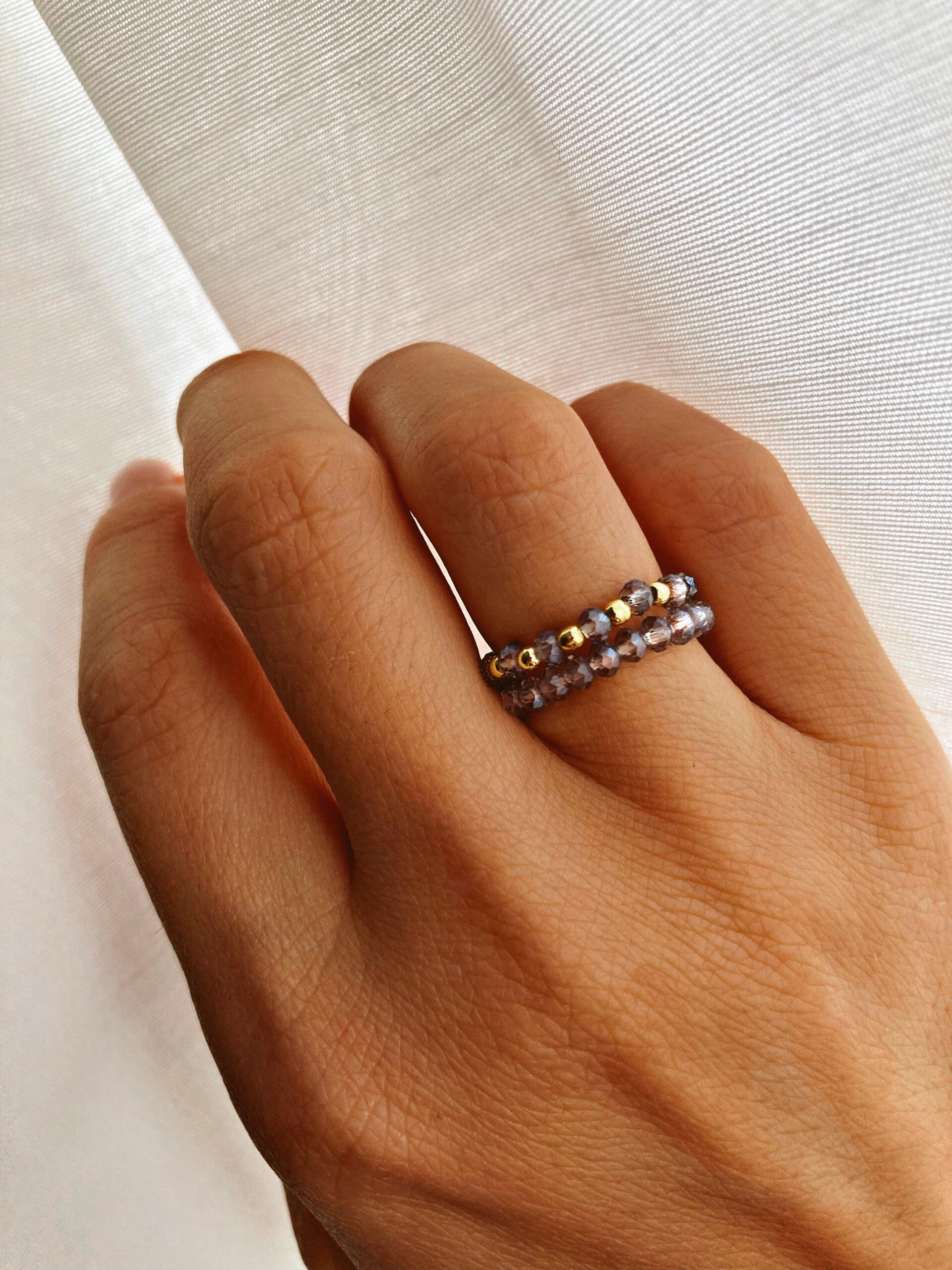 Nježan i elegantan prsten izrađen od sitnih sjajnih kristalnih perli koje reflektiraju svjetlost i daju suptilan, sofisticiran sjaj. Zahvaljujući elastičnoj niti, prsten je prilagodljiv i udoban za nošenje, te odgovara veličinama 10–12. Minimalistički dizajn čini ga savršenim za svakodnevno nošenje ili kombiniranje s drugim prstenjem.